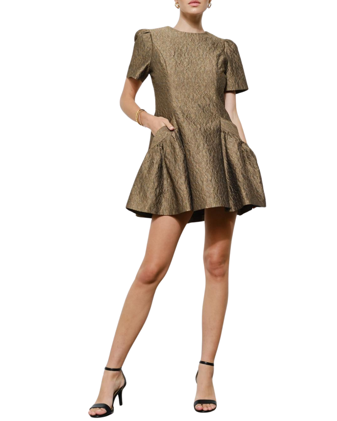 VESTIDO CORTO STRAPLESS BEIGE CON DORADO