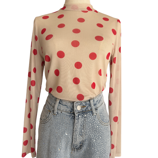 BLUSA MESH MANGA LARGA BEIGE CON PUNTOS ROJOS