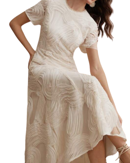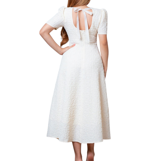 VESTIDO MIDI BEIGE CON MANGAS CUELLO CON PERLAS Y LISTÓN SIN ESPALDA