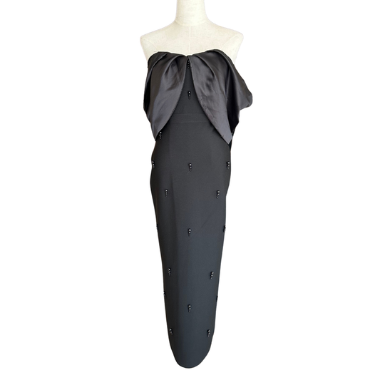 VESTIDO NEGRO MIDI CON APLICACIONES Y MANGA DE MOÑO SATÍN