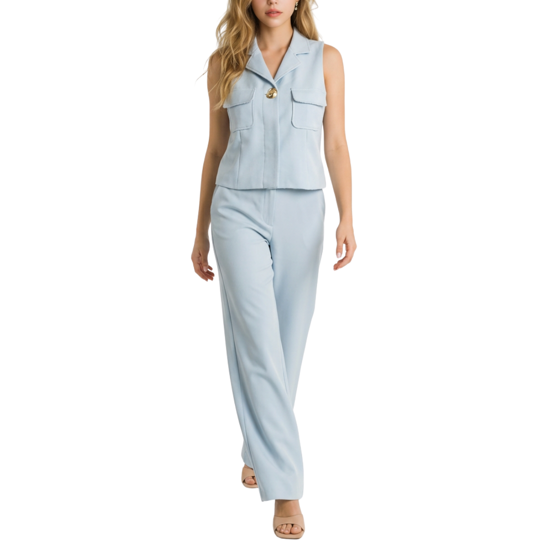 SET CHALECO CON BOTÓN DORADO Y PANTALÓN CELESTE